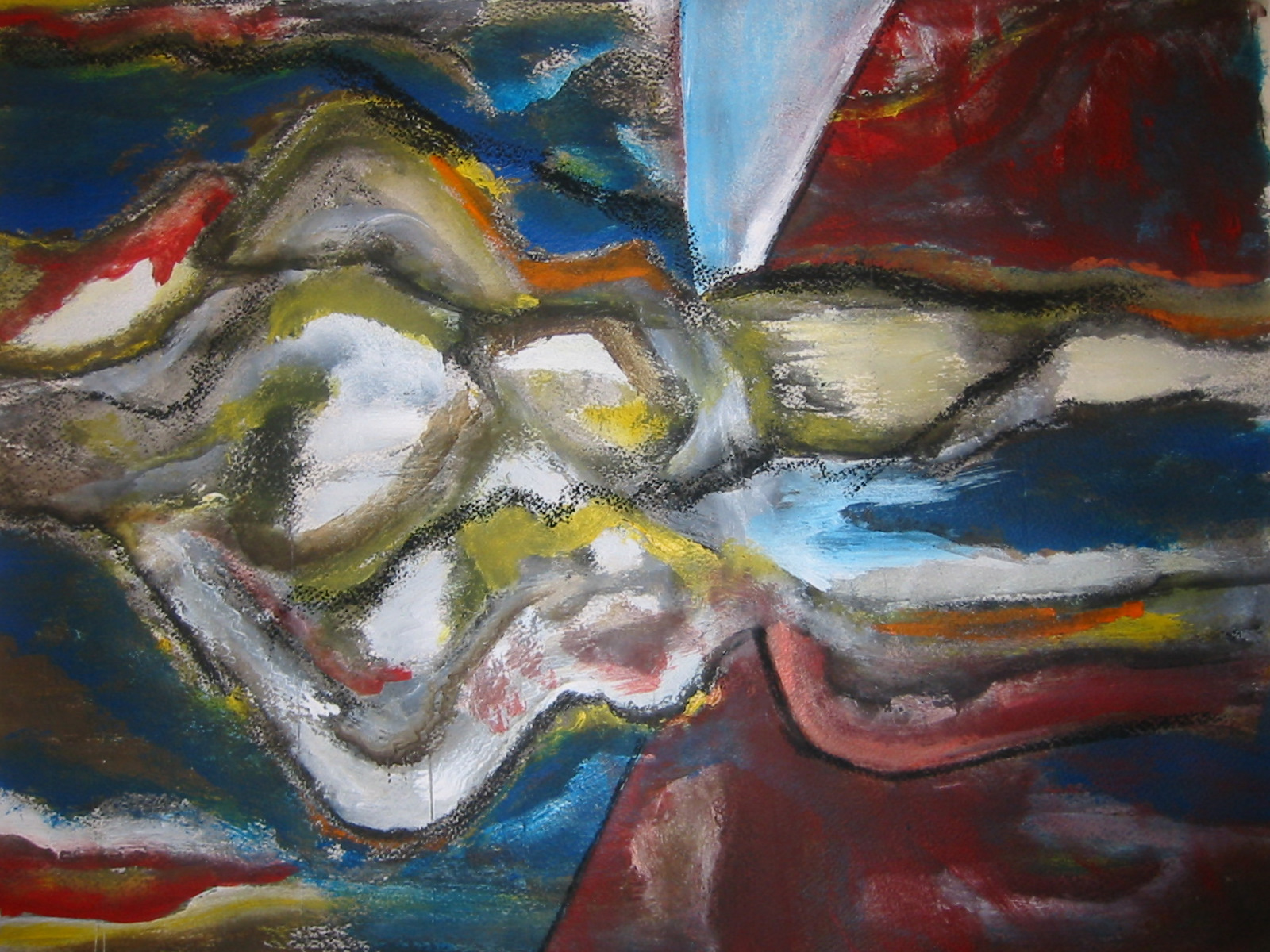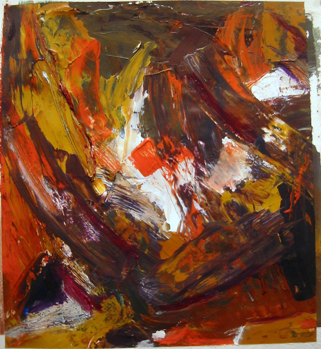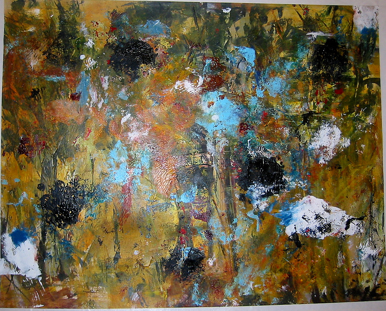 With ever-improving compositional skills each person took an unresolved painting begun by another and used whatever color, form, contrast, rhythm, texture and line that was in front of them as vocabulary with which to make their own visual statement.