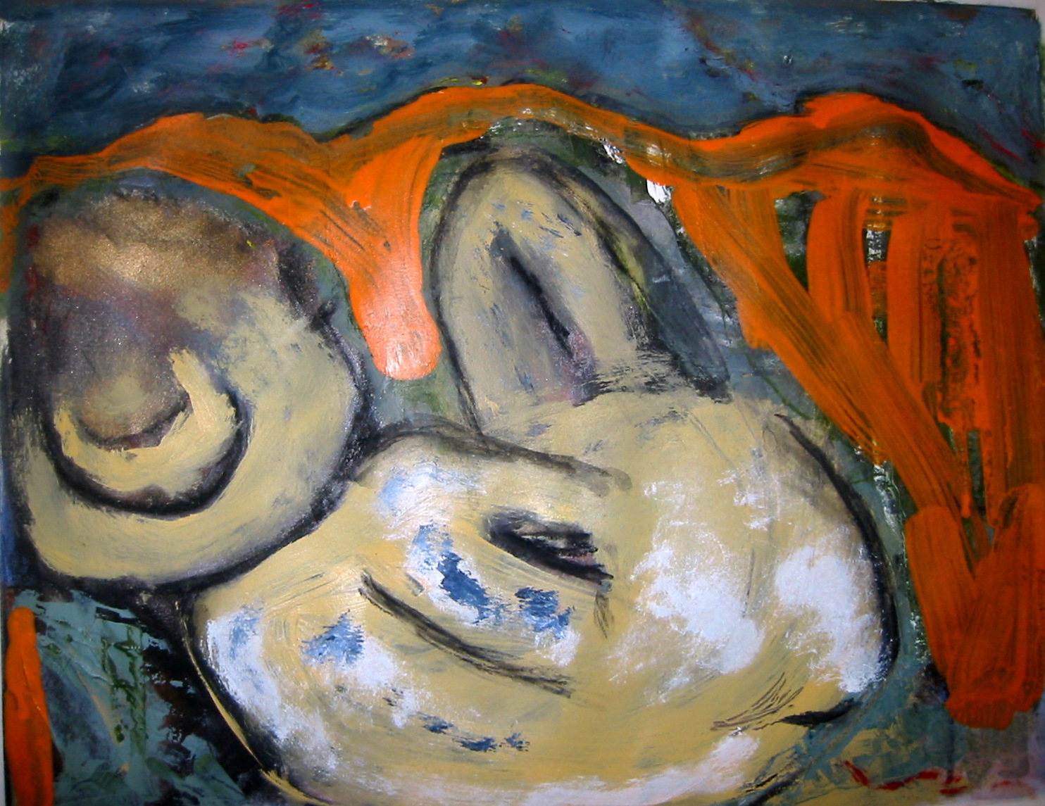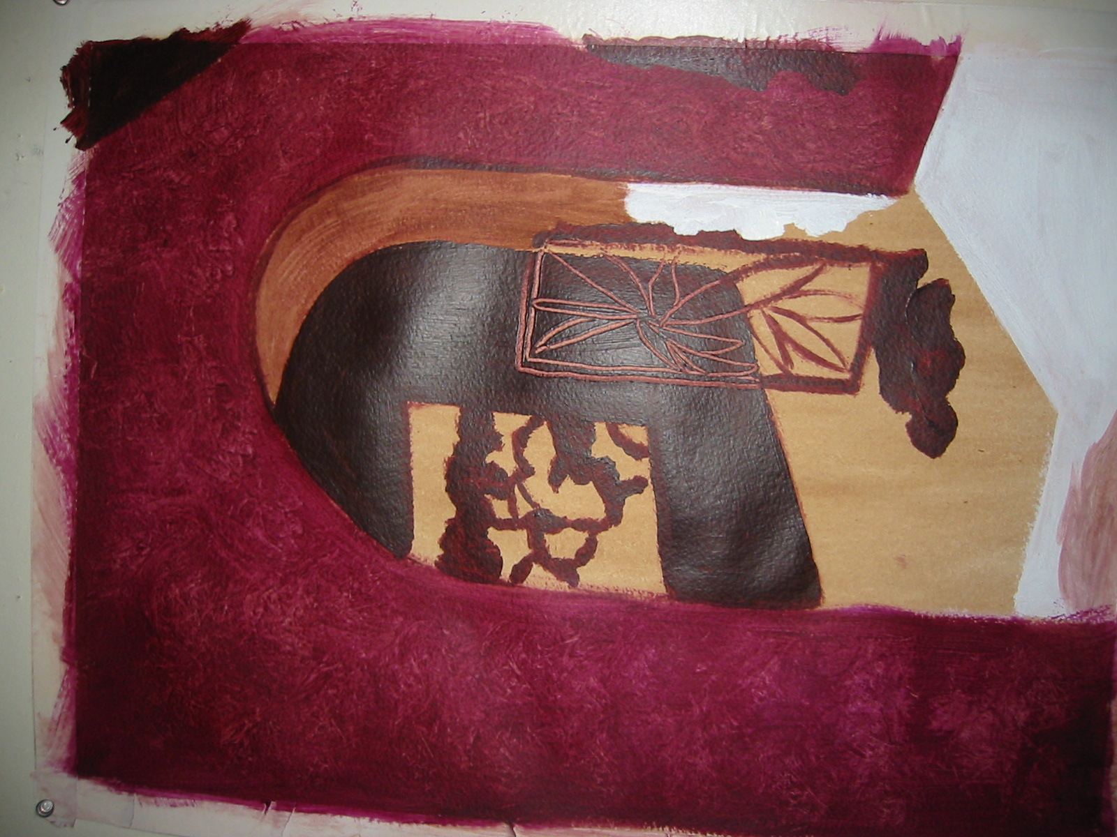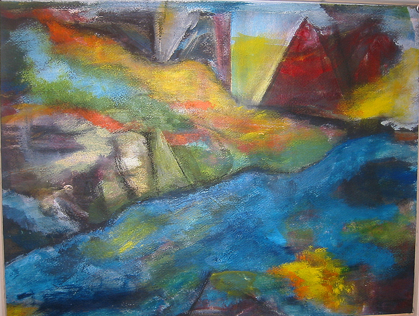 With ever-improving compositional skills each person took an unresolved painting begun by another and used whatever color, form, contrast, rhythm, texture and line that was in front of them as vocabulary with which to make their own visual statement.