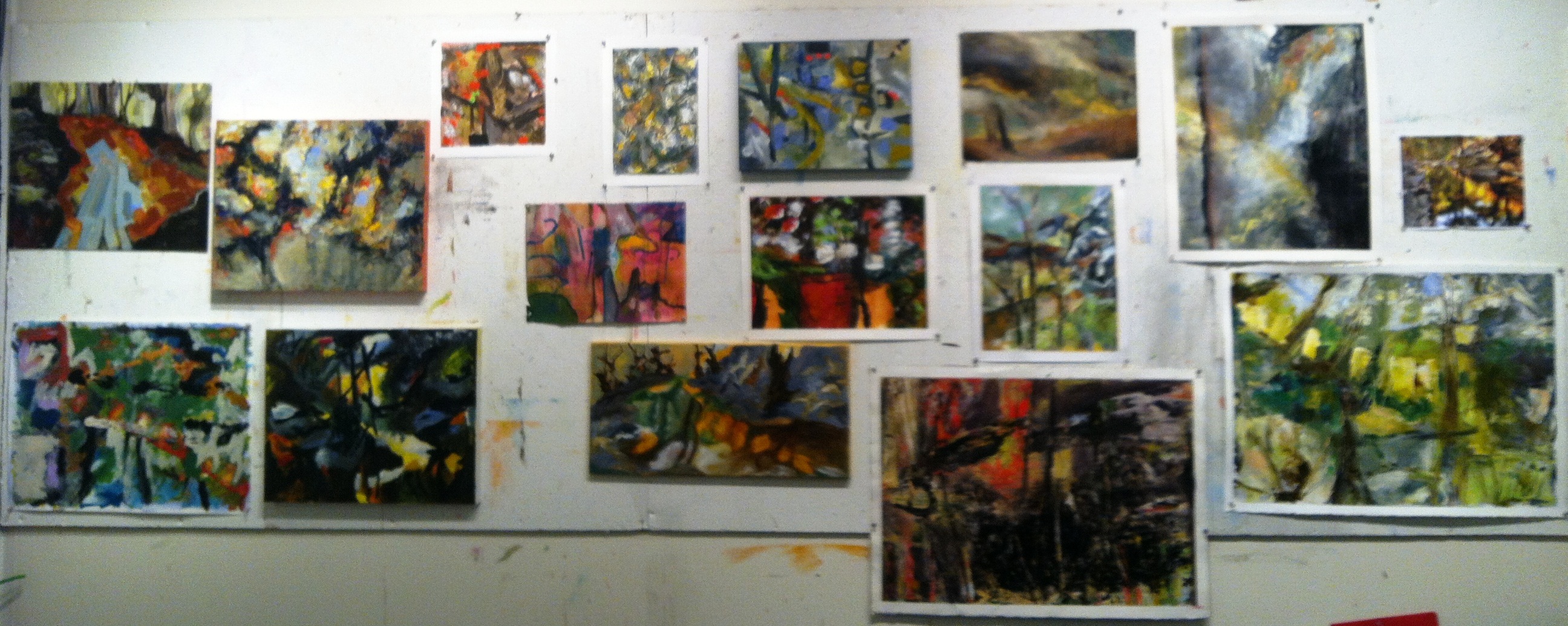 Obviously this applies to painting too, as we have discussed many times. However, as can be witnessed below, effective expression can come about even though the choice of subject was imposed upon reluctant artists. (For those who were not in class, these paintings-still in progress– all originated from the small photocopy on the far right. There was an inordinate amount of whining about this image. Note to self: Ignore Whining.)
