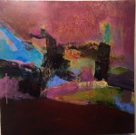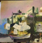 - Adjusting color. Capitivated by the velvety dark and outrageous berry color. Never have used a palette like this. Time to quit for the day. Next studio day I will spend time analyzing compositional structure and work to develop tension AND harmony. But the biggest question will be “what connects me to this? Where is the strongets pull?” Do I keep color or use it as a base for a creamy white veil? Do I add more contrast or make an evening glow? Simlify or make more complex? What does it want to be about? Where do I want it to take me? Where do I hope it might lead a viewer? Do I want it to relate to the rest of the work in the studio? Maybe I just want to explore the mood of color in similarly structured landscapes? Don’t know yet. I will think about this painting as I fall asleep and as I ready for tomorrow. I might reveiw work by artists I admire and see what they can tell me about my work. Do I want to emulate them, or go the other way? Hopefully there will a time to stop thinking about it after I ponder the questions? We’ll see what happens.